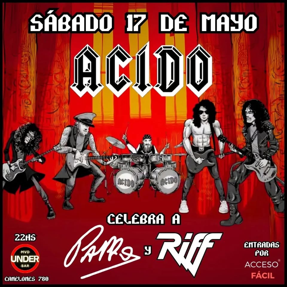 Los muchachos de Ácido, la banda que da el puntapié a la movida metal en Uruguay, fueron la anfitriona en una noche que comenzó con un set de Pappo’s Blues donde el aderezo y el postre del homenaje tuvo a destacadísimos músicos de los años 80’s y 90’s del rock y el metal charrúa: en las baterias de Ariel “Quieto” Gerona (Luz Roja), Alvaro Buxedas (Zero, Perro Salvaje, Monalisa, Armaggedon), los bajos de Tony Aversa (Pelo, Alvacast, Macbeth, Narval, Cronos), Gabrihell Barbieri (Ácido, Chicos Eléctricos, Mafia, Radical, Motosierra), y en las guitarras la presencia destacadísima de Rafael “Funfu” (NN Opera, Mística, Zero entre otros: ganador “Mejor guitarrista” del Festival “Montevideo Rock l” (1986)), Pedro Alemanni (Rada, NN Opera), Pedro Riñon (Ácido) hasta la sorpresa de Shaggy (hijo de Danny Acuña) en la jungla de las 6 cuerdas, entre otros con un frontman inesperado (por temas de salud): Varo Coll que en el set dedicado a Riff estuvo acompañado por Fabián “Chupete” Furtado (ReyToro, Chopper) en un set lleno de nostalgia que tuvo hasta sus momentos de “stand up” con anécdotas varias en aquellos años tan difíciles en las calles de Montevideo.