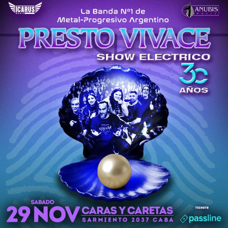 El próximo sábado 29 de noviembre, la emblemática Sala Caras y Caretas (Sarmiento 2037, CABA) será testigo de una noche especial: PRESTO VIVACE celebrará tres décadas de trayectoria con un show eléctrico que promete repasar lo mejor de su carrera, en una cita imperdible para los amantes del metal progresivo argentino. El concierto comenzará a las 20:00 horas y las entradas ya están disponibles a través de Passline. Formada en los años ‘90, PRESTO VIVACE se consolidó como una de las bandas más influyentes del género progresivo en la Argentina. Con una propuesta que combina técnica, experimentación sonora y composiciones de gran profundidad, el grupo liderado por Marcelo Pérez Schneider supo ganarse un lugar de respeto tanto en la escena nacional como internacional.