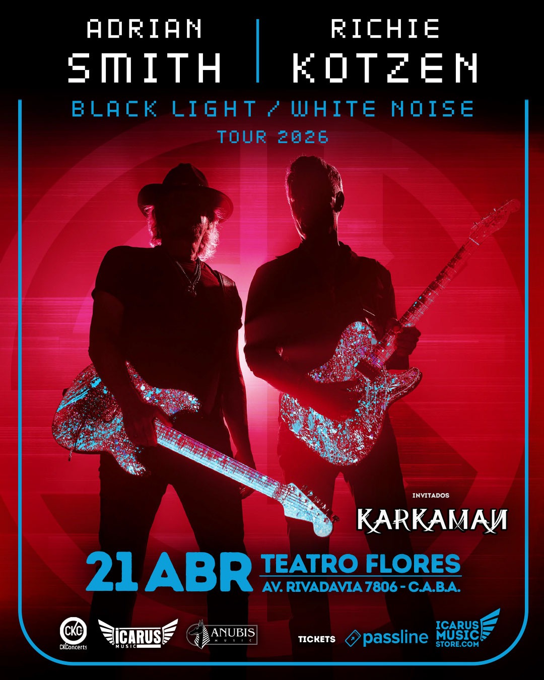 Buenos Aires atravesó una semana extraordinaria para el metal y el rock pesado. Shows grandes, venues colmados, fanáticos que saltaron de un recital al otro con la energía de quien sabe que estas noches no se repiten fácilmente. En ese contexto —y apenas un día después del paso de In Flames por el mismo Teatro Flores— Adrian Smith y Richie Kotzen se presentaron ante un público que llegó exhausto, pero que no iba a perderse esto por nada del mundo.